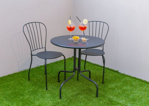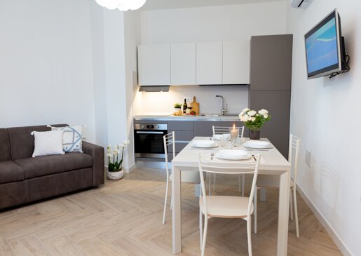 una camera da letto matrimoniale, cucina-soggiorno con divano letto matrimoniale, bagno, terrazza con tavolino da esterno.